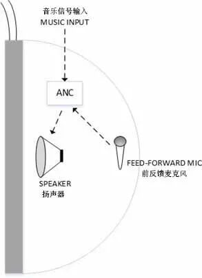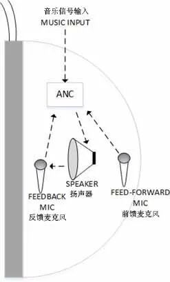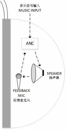 图2 前馈式ANC体系结构 2 反馈式拓扑结构 反馈式ANC体系结构示意图如图3所示。这种拓扑结构也是仅使用一个麦克风,但是它被放置于更靠近用户耳朵的位置。这种拓扑结构的主要优点是麦克风接收到的信号与传入用户耳中的信号完全相同,并且有一个反馈循环,可以反复迭代计算消除系统中的噪声。虽然这种结构的低频性能良好,但对1k-2kHz之间的频率衰减不如前馈结构有效。这种结构适用于去除主噪声信号中残留的可预测窄带分量。尽管不能有效地消除中高频的噪声,它依然是在耳机中使用ANC技术时最常用的拓扑结构之一。这种局限性是由于次级路径(从ANC模块的输出一直返回到其输入的信号路径)中引入的相移造成的——这导致该拓扑无法有效消除噪声的高频分量。在此配置中,使用的麦克风需要在频率上有一个平坦的群延迟,并且多个麦克风之间的差异应尽可能小。