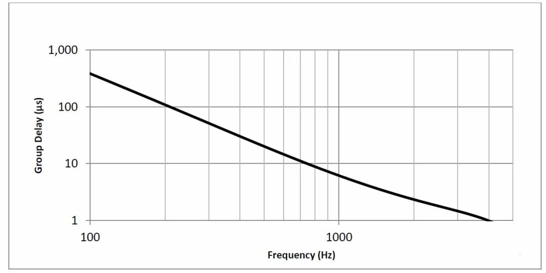图9 标准差-相位响应 从这些图中,可以清楚地看到IM69D130的幅值和相位响应公差非常小。这确保了多个麦克风之间拐角频率和相位响应的差异很小,有助于确保ANC算法的实现更加准确。 2 群延迟 在实验室中对IM69D130样本进行了群延迟测量,图10提供了在整个频带上观察到的典型群延迟。从数据中可以看出,在1kHz处群延迟小于10µs。这样低的群延迟将有助于更好地实现ANC算法。