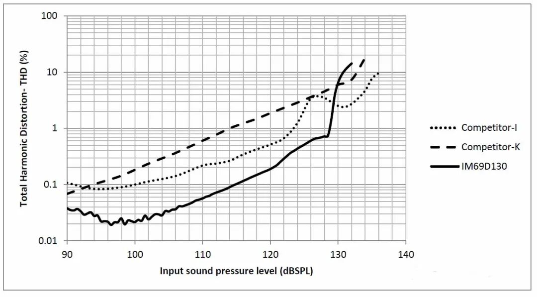 图10 群延迟vs频率 3 总谐波失真THD 麦克风的另一个关键规格是AOP。图11显示了IM69D130和两个竞品的THD与SPL图。IM69D130在SPL 130dB时THD达到了10%临界,这是该麦克风的AOP规格。该款麦克风的特点之一是在SPL小于128dB时,THD范围在1%以内。此特性有利于以极小的失真采集强噪声信号,ANC算法能更加高效的运行。在图11中展示的竞品麦克风在AOP规格上相较于IM69D130略优,但从图中可以很清楚地看到,IM69D130与其他两个麦克风相比,在SPL低于128dB时,THD值明显要比其他两个竞品麦克风低很多。