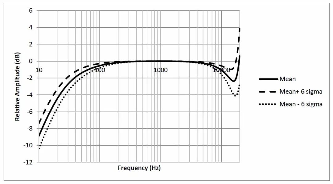 图5 复合ANC拓扑结构框图 复合式ANC耳机的设计是三种拓扑结构中有能力提供最好的ANC性能和最宽的降噪带宽的一种设计。然而,由于增加了成本和设计的复杂性,复合式设计并没有被广泛使用。这种类型的架构在高性能ANC耳机设计中是上佳之选,高端耳机并不会以低成本为首要考量。不过即使在这个结构中,高于2kHz部分的ANC性能也不十分令人满意。因此,耳机设计者们通常也会用被动降噪技术来提升高频的降噪性能。 耳机也可以根据其在人耳周围的位置进行分类,如入耳式、贴耳式和覆耳式耳机。对于覆耳式和贴耳式耳机,可以用被动和主动降噪技术相结合的方式,在整个音频带宽上ANC算法表现卓越。对于入耳式耳机,由于耳塞周围没有充足的物理空间,传统的被动降噪技术对高频噪声消除效果不佳。因此,这种入耳式ANC耳机中选用的麦克风要有利于高频噪声消除。 如果麦克风具有较低的群延迟和比较平坦的频率相位响应,高频性能就可以有所提升。相位响应的公差也很重要,此规格的严格管控有利于ANC算法高效运行,而且高频降噪性能更好更稳定。 4 Infineon(英飞凌)麦克风提供的解决方案 ![]() Infineon(英飞凌)科技的数字麦克风IM69D130,SNR高达69dB,AOP达到SPL 130dB,同时具备这两项优异的指标,此款麦克风是降噪耳机设计案例中优秀的选择,它的规格和公差符合本文档前几节讨论的所有标准。 1 幅值和相位响应 如前所述,在降噪耳机的设计中,截止频率和相位响应的公差对麦克风的选择起着重要作用。图6,图7,图8和图9是IM69D130麦克风幅值和相位响应的均值和标准差。还提供了其6σ门限以供参考。测试温度为25°C。