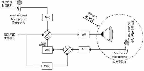 图4 复合式ANC体系结构 图5是复合式ANC拓扑结构的简化框图。这个图显示了两个信号通路是如何联合工作的。G(w)和M(w)是增益和相位补偿滤波器,Dff和Dfb是由于系统中扬声器和麦克风引入的延迟。