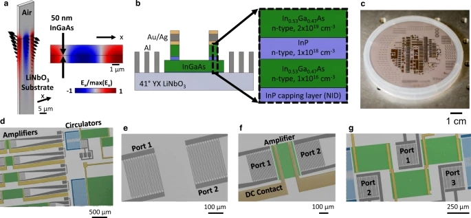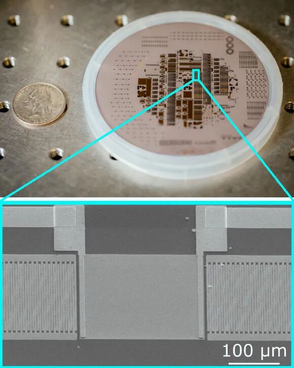 声电芯片包括射频放大器、循环器和滤波器;扫描电镜图像显示了放大器的细节。图片来源:Bret Latter / Matt Eichenfield。